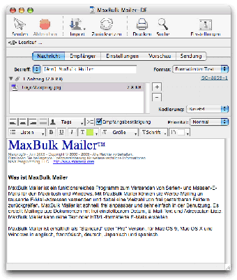 MaxBulk Mailer versendet sowohl reine Text- als auch HTML-Mails. Anhand so genannter Tags gibt man den Nachrichten den individuellen Anstrich. Dabei spielt es keine Rolle, ob man Produktkataloge, Pressemitteilungen oder Preislisten versenden möchte. Bei Bedarf hängt MaxBulk Mailer den E-Mails zusätzlich Attachments an.