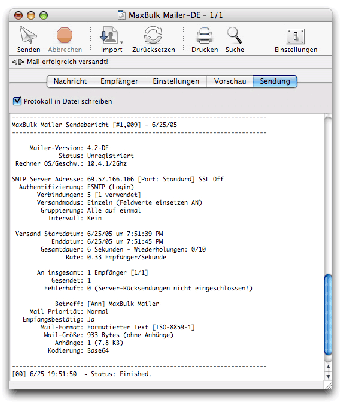 Eine integrierte Protokollfunktion merkt sich detailliert, wer bereits eine Mail erhalten hat, welche E-Mail-Adressen nicht funktionieren oder nicht mehr existieren. Zudem unterstützt die Software POP3-, APOP- und ESMTP-Authentifizierung.